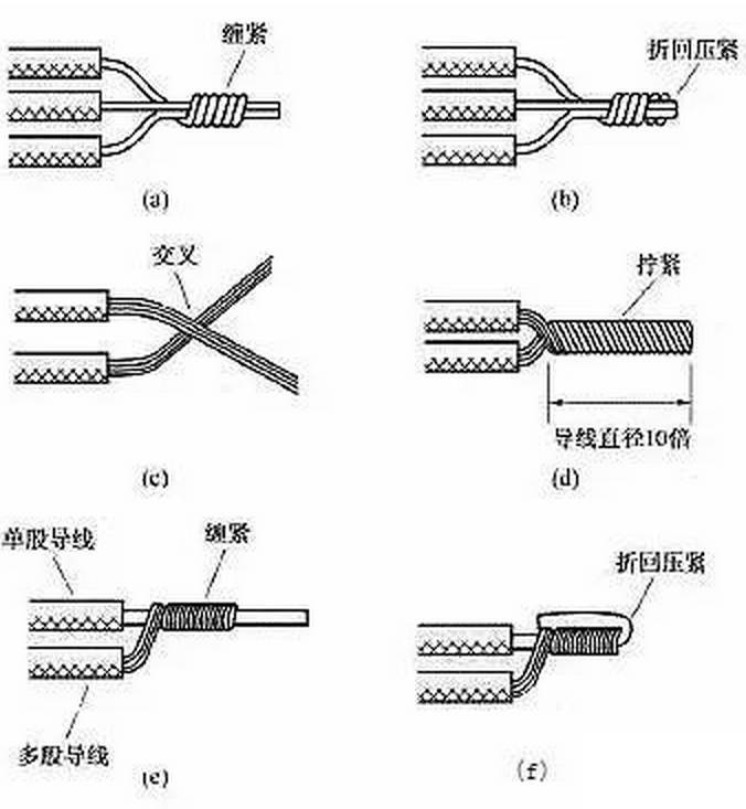 (6)同一方向的導線的連接。當需要連接的導線來自同一方向時,可以采用圖10所示的方法。對于單股導線,可將一根導線的芯線緊密纏繞在其他導線的芯線上,再將其他芯線的線頭折回壓緊即可。對于多股導線,可將兩根導線的芯線互相交叉,然后絞合擰緊即可。對于單股導線與多股導線的連接,可將多股導線的芯線緊密纏繞在單股導線的芯線上,再將單股芯線的線頭折回壓緊即可。