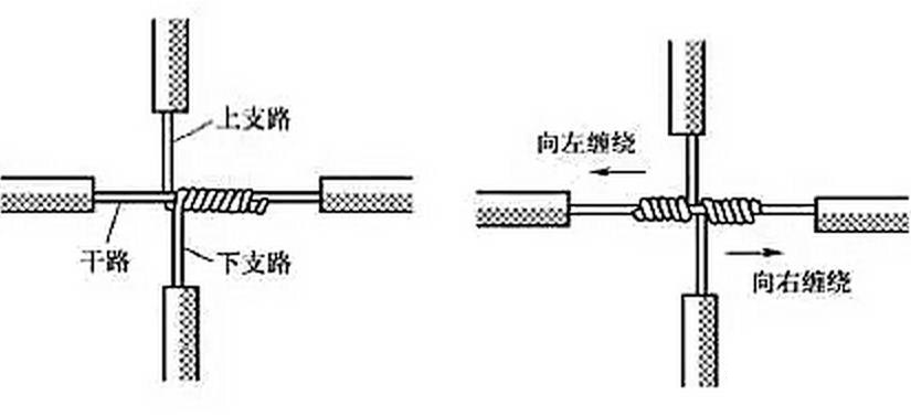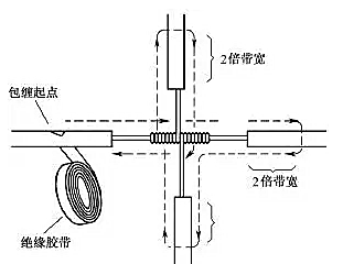 導線分支接頭的絕緣處理基本方法同上,T字分支接頭的包纏方向如圖21所示,走一個T字形的來回,使每根導線上都包纏兩層絕緣膠帶,每根導線都應包纏到完好絕緣層的兩倍膠帶寬度處。