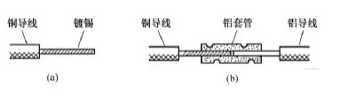 另一種方法是將銅導線鍍錫后采用鋁套管連接。由于錫與鋁的標準電極電位相差較小,在銅與鋁之間夾墊一層錫也可以防止電化腐蝕。具體做法是先在銅導線的芯線上鍍上一層錫,再將鍍錫銅芯線插入鋁套管的一端,鋁導線的芯線插入該套管的另一端,最后壓緊套管即可,如圖16所示。